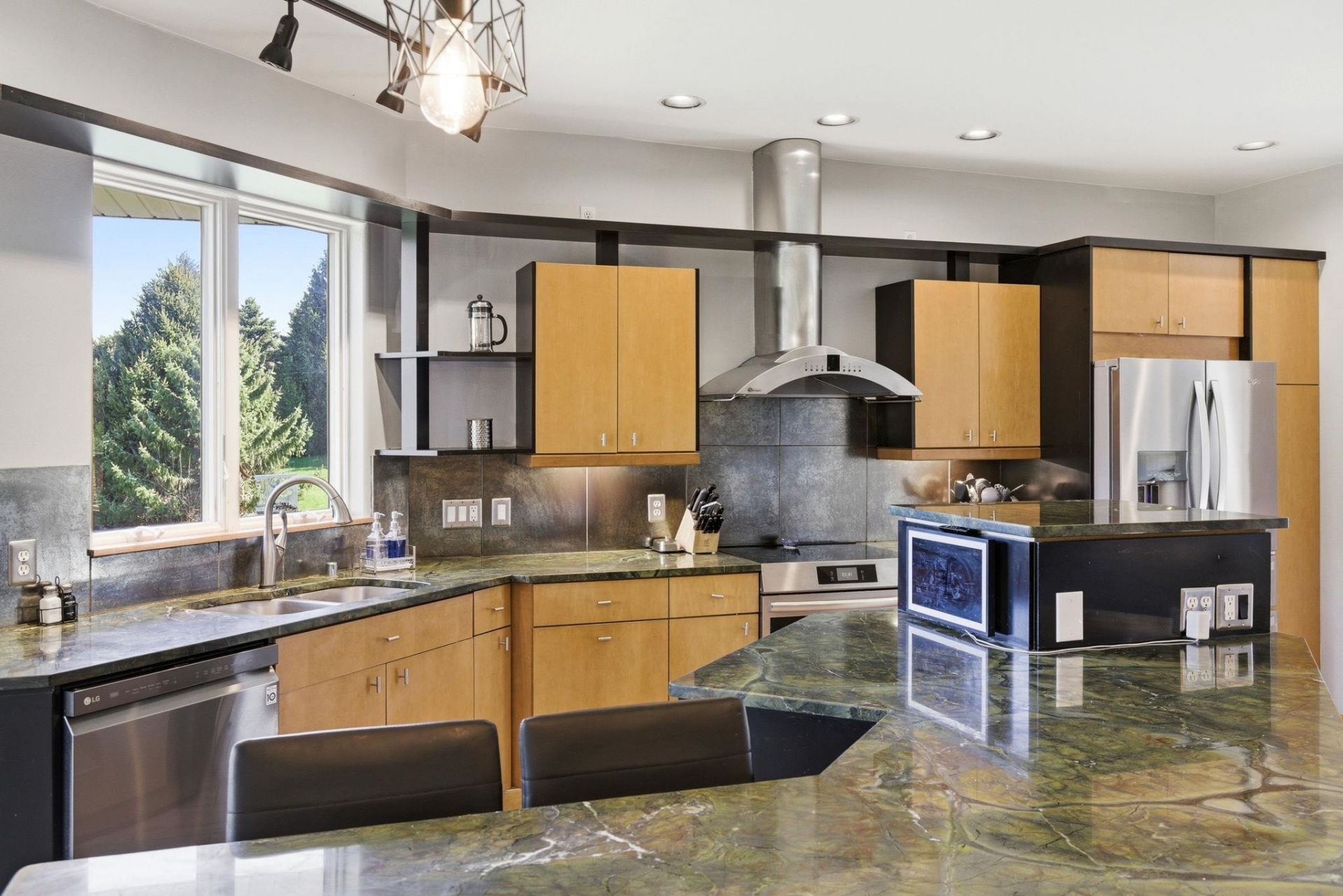 Spacious 4 bed, 3.5 bath home, office and bonus room or 5th bedroom on 2 private acres near the heart of Verona?shops, dining, and amenities just minutes away! Offering almost 4,000 st ft this property is ideal for hobbyists with a 6-car garage and dedicated workshop. Surrounded by mature pines, the yard provides a peaceful setting. Inside features tall ceilings, ceramic tile, and a sunken family room with wood floors and scenic views. Kitchen boasts beautiful emerald green granite counters, GE Monogram induction cooktop (2025), pantry, and mudroom with cubbies. Primary suite offers dual private bathrooms, 2 walk-in closets, a jetted tub, and makeup station. Walkout lower level includes new LVP flooring, spacious living room, bar/rec room, flex space, 2 bedrooms, full bath, and large laundry. Ample storage throughout waiting for your finishing touch!